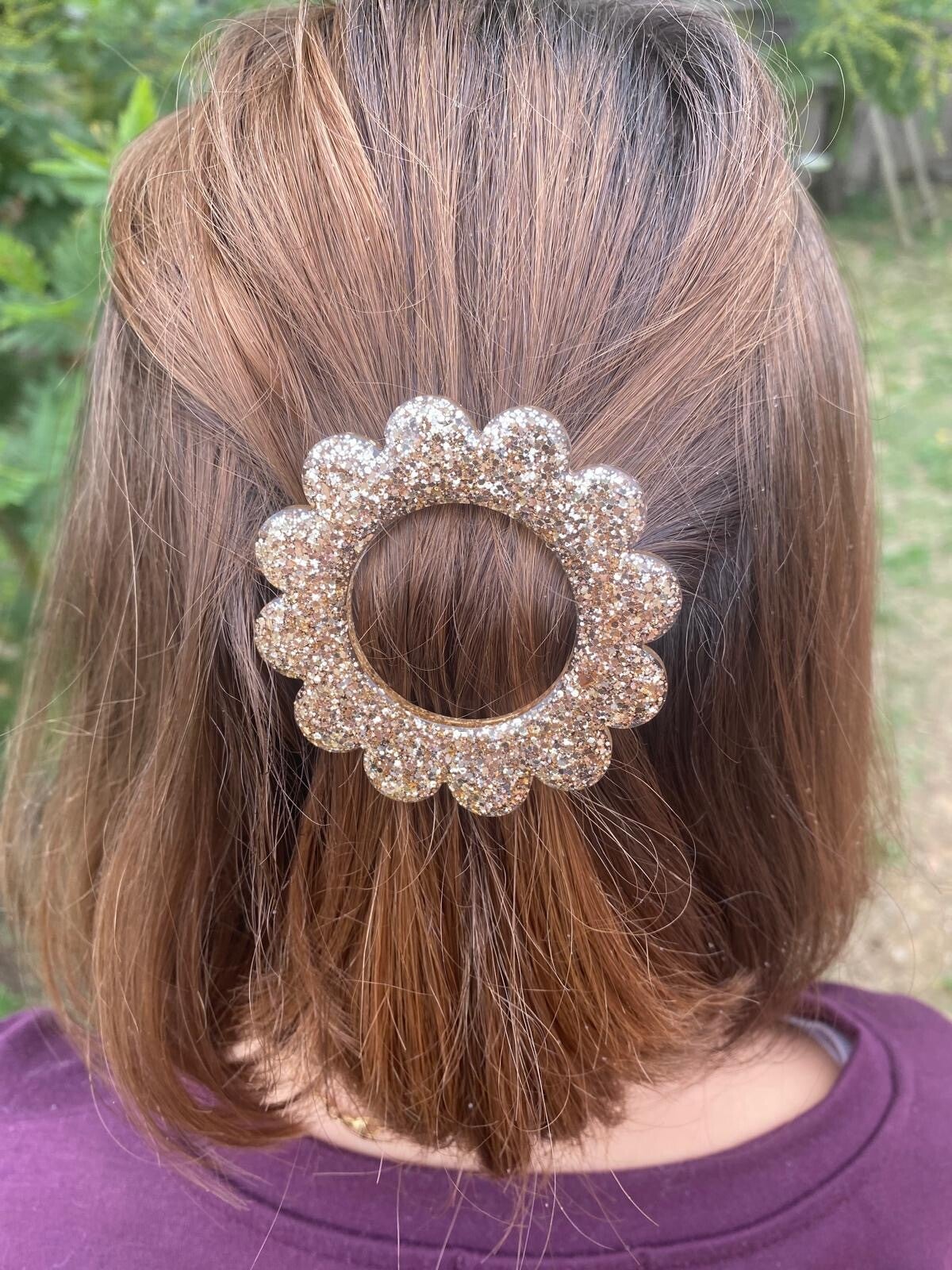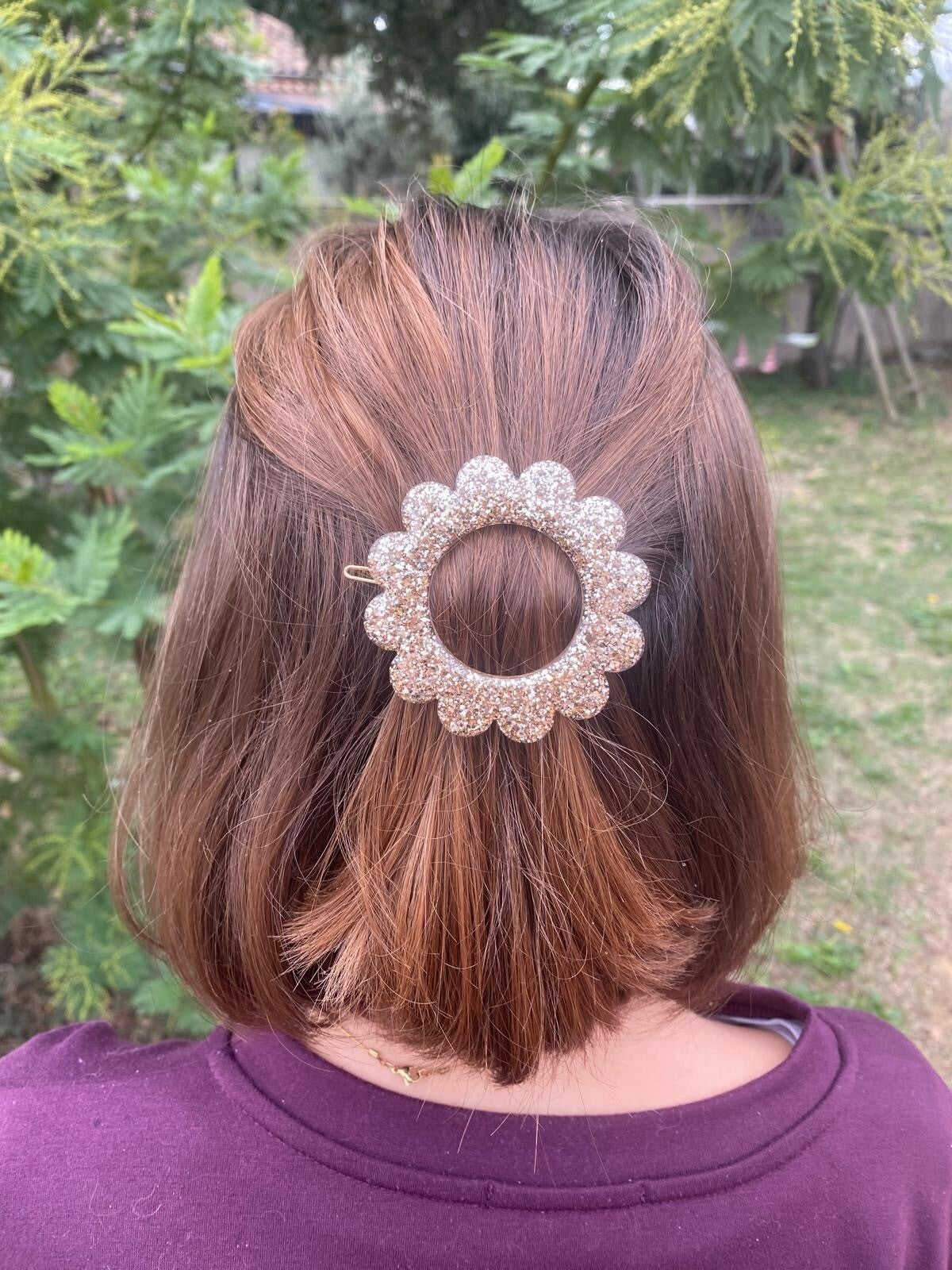 Barrette fleur en résine, la fleur mesure 6,5 cm et la pince 4,6 cm.